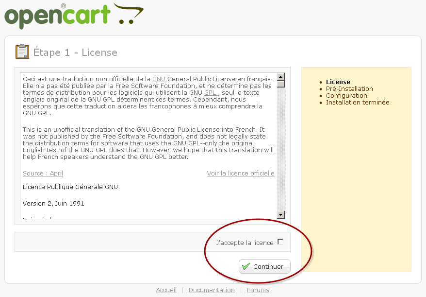 Vous devez cocher la case à côté de « J accepte la licence » et cliquez sur le bouton « Continuer » pour poursuivre.
