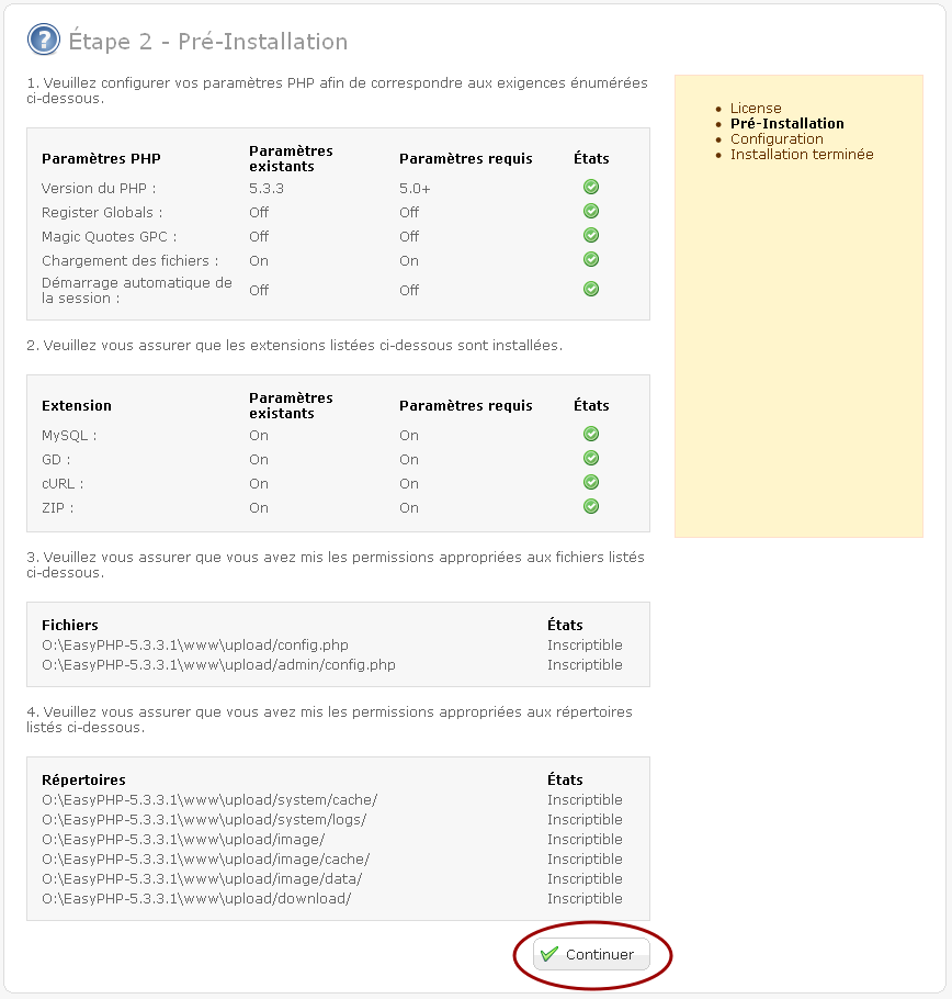 L'écran suivant de la procédure d'installation (voir l'image ci-dessous) est une liste des réglages nécessaire à OpenCart et s'ils sont satisfait par votre serveur web. Ce que vous cherchez à obtenir est une coche verte pour chacun des attributs dans des sections «  Paramètres PHP » et « extensions » et « inscriptible » pour chacun des fichiers et répertoires listés dans les deux dernières sections.