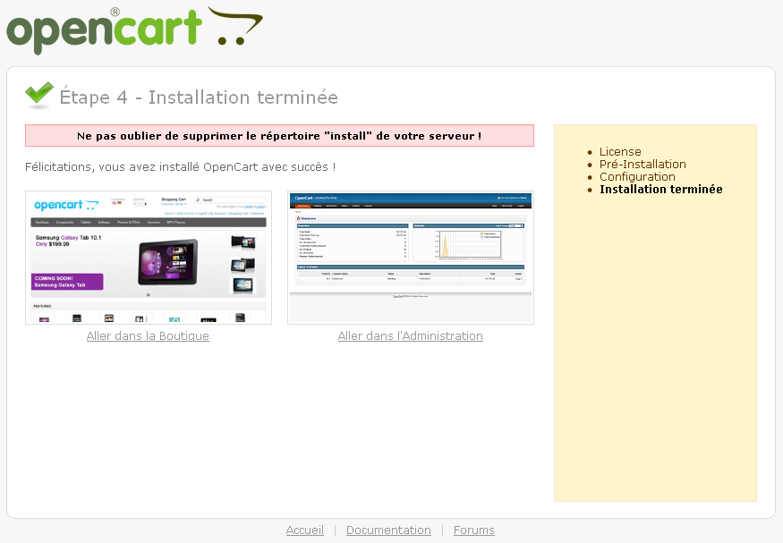 A moins que vous ayez saisi des valeurs incorrectes pour les détails de la base de données, vous devriez voir un écran confirmant la fin de l'installation et que votre boutique OpenCart a été correctement installée (voir l'image ci-dessous)
