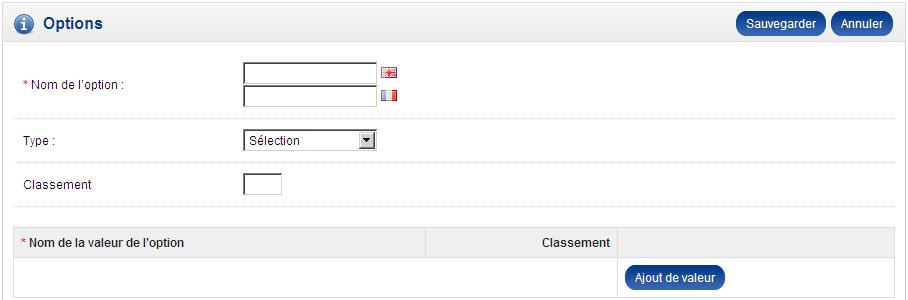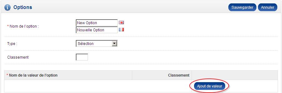 Classement : Si cette option doit comporter plusieurs valeurs, indiquez ici un nombre afin de déterminer l’ordre d’affichage des différentes valeurs de l’option. Plus le nombre sera petit, plus la valeur sera placée en haut de la liste.