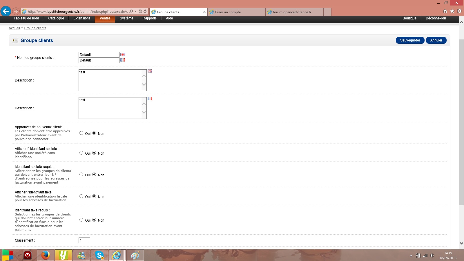 On crée la catégorie de clients que l'on souhaite (par exemple : Professionnels, vente en gros ou grossistes, particulier, etc...) en paramétrant leur compte avec les options que l'on désire (identifiant taxes et identifiants société).